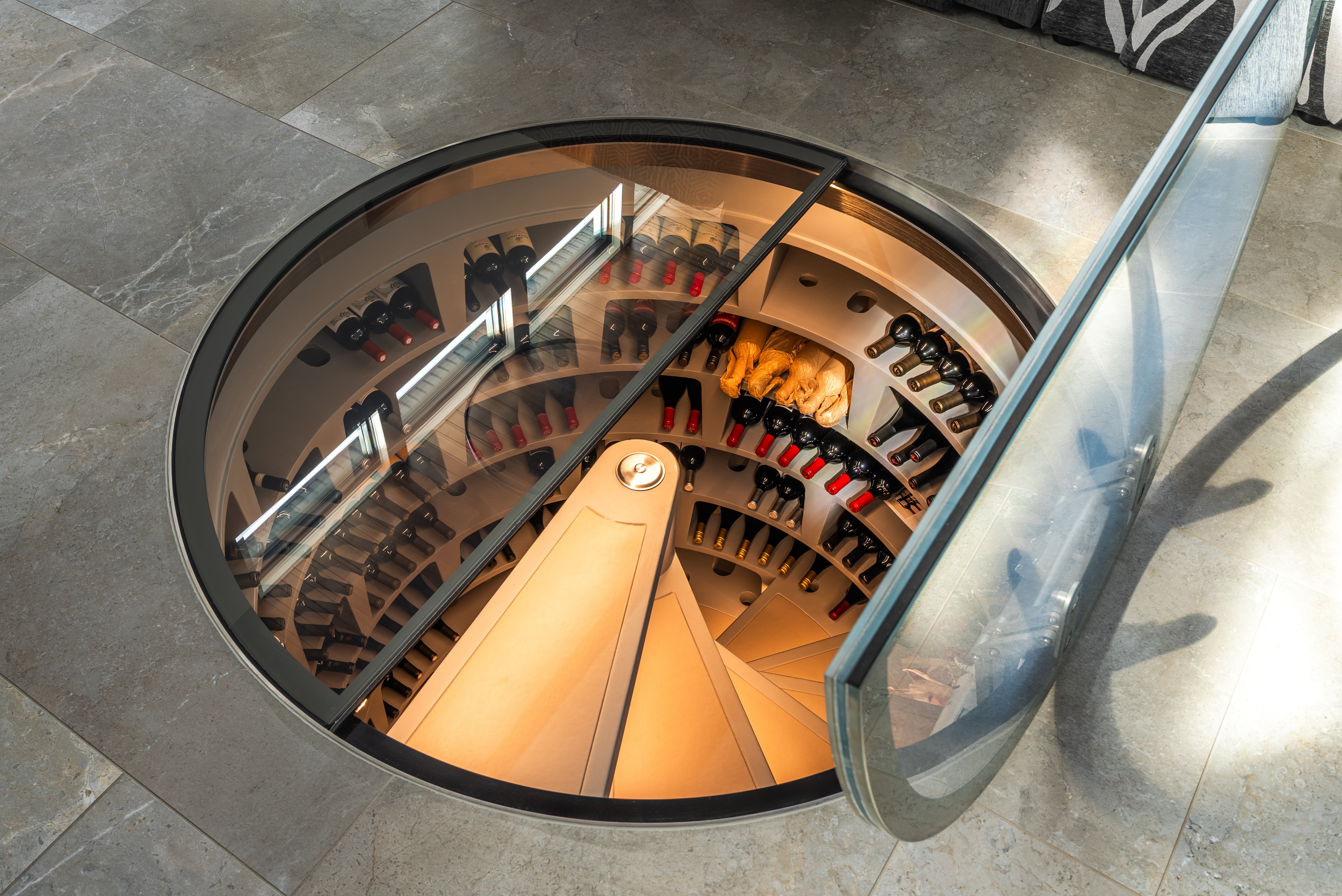 Two fully custom, glass-enclosed, floating wine walls designed for both preservation and presentation. Featuring The Ring floor-to-ceiling cable racking system, they offer a striking suspended bott...